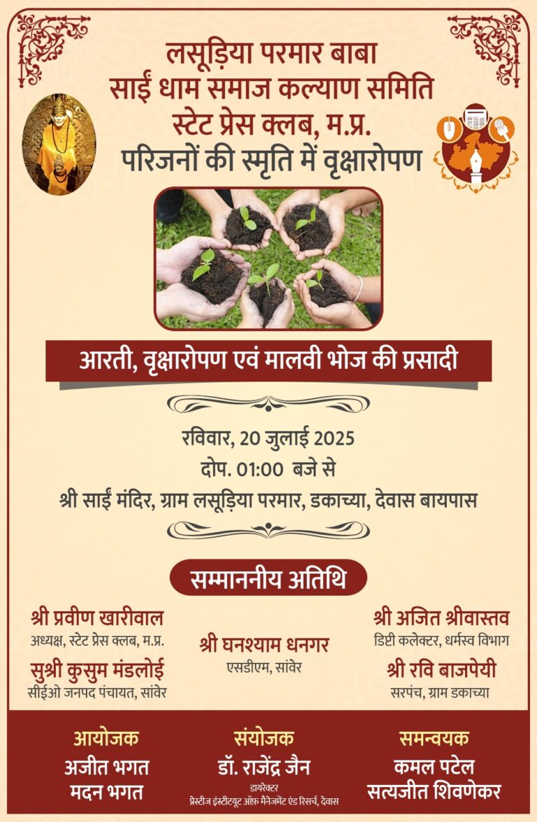 Indore (Team Newsbuddy): Lasudiya Parmar Baba Sai Dham Samaj Kalyan Samiti and State Press Club (MP) will jointly organise plantation...