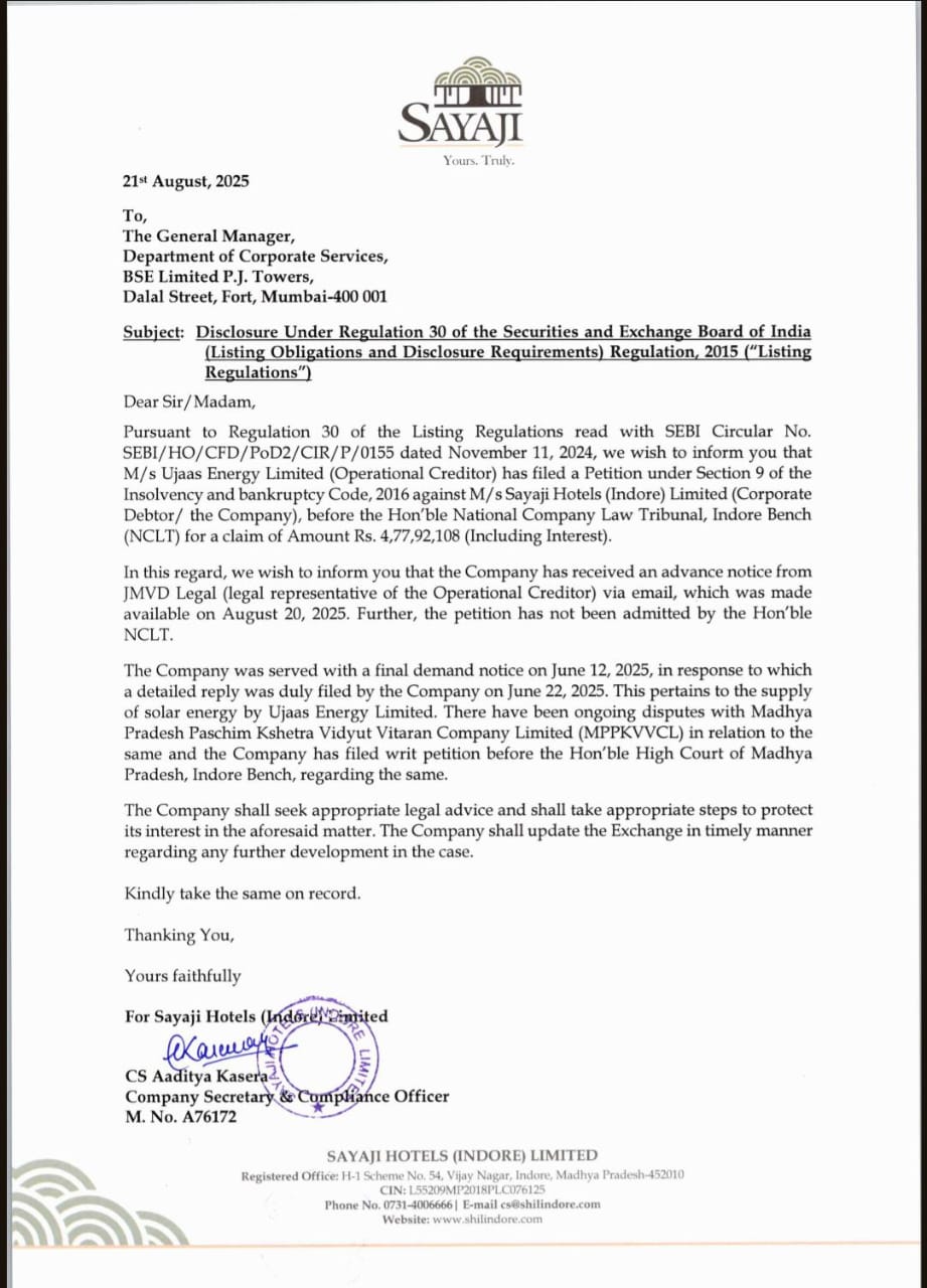 The insolvency petition marks a significant escalation in a contentious dispute between Sayaji Hotels and Ujaas Energy. According to a letter dated August 21, 2025, from Sayaji’s Company Secretary, Aaditya Kasera, to the Department of Corporate Affairs, Mumbai, the company received an advance notice of the petition via email from JMVD Legal, representing Ujaas, on August 20, 2025. This followed a final demand notice issued on June 12, 2025, to which Sayaji responded with a detailed reply on June 22, 2025, indicating a pre-existing dispute over the claimed amount.